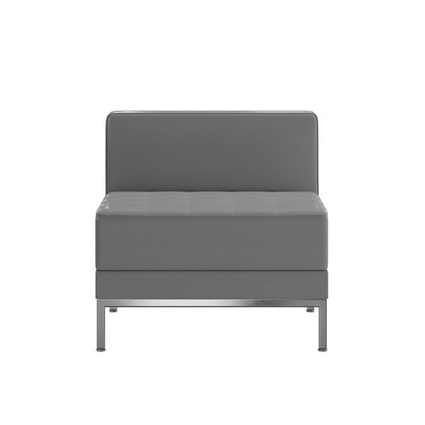 Moving your furniture around is a quick and easy way to change up the look and feel of your space so modular pieces like this gray LeatherSoft upholstered middle chair are a must have. LeatherSoft is leather and polyurethane for added softness and durability. This modern armless chair gives an upscale, sophisticated look to any space and can be used in conjunction with other pieces or as a standalone. Exposed stainless steel and LeatherSoft upholstery master the art of mixed media giving you a distinctive look your guests and clients are sure to appreciate. As your business grows, you can add on more pieces and reconfigure your design. This innovative contemporary chair will bring comfort and trend-setting style to your waiting room, reception area or lounge.