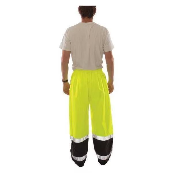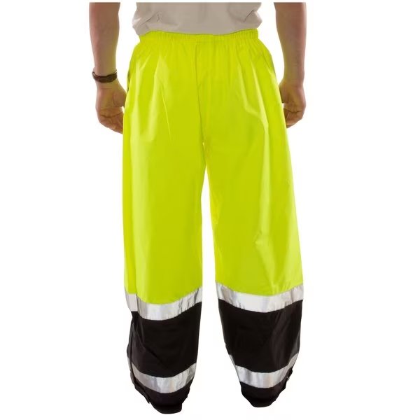 High-Visibility Pants, ANSI Class E, Gender Men's, Style High Visibility Pants, Color Black; Green; Yellow, Material Polyurethane, Waist Closure Pull On, Leg Fit Straight Leg, Number of Outside Pockets 2, Fly Closure Type Snap, Fabric Weight 75 den, Includes Lining Yes, Insulated for Cold Conditions No, Inseam 28 in, Maximum Waist Size 34 in, Minimum Waist Size 32 in, Size S, Reflective Tape Type Glass Bead, Reflective Stripe Border Type None, Garment Features Black Cuffs