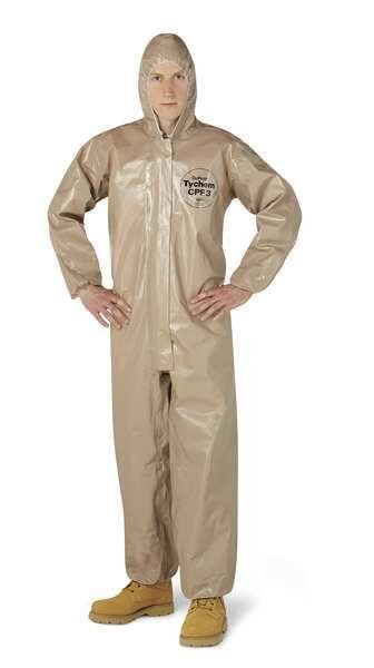 Coveralls, Ankle Closure Elastic, Anti-Static No, Attached Hood Yes, Breathable Back Style Not Applicable, Chest Size - Maximum 40 3/4 in, Chest Size - Minimum 37 1/4 in, Clean Process Status Not Clean Processed, Closure Features Storm Flap, Closure Type Zipper, Collar Style Plain, Color Tan, Coverall Style Hooded, Cuff Style Elastic, EPA Protection Level B