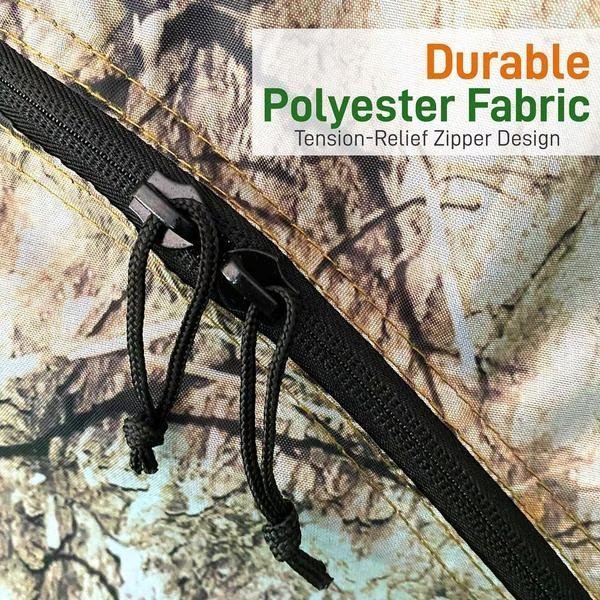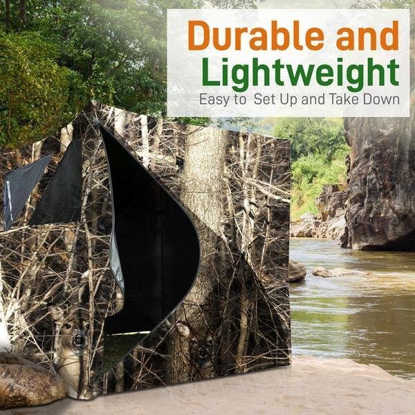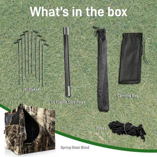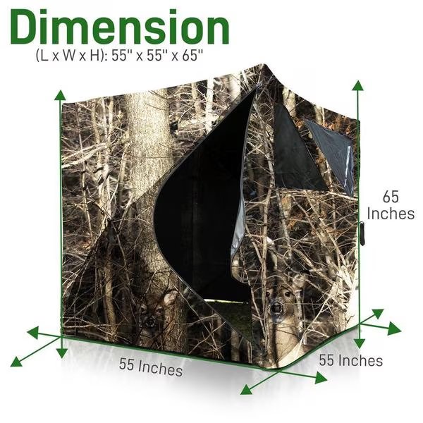 Features: - Shoot-Through Mesh with Gun Port - Durashell Plus - Shadow Guard - Easy to Open/Close - Care Taker Ground Blind with One Door and Three Large Windows - Tension-relief Zipper Design - Comfortably Accommodates Two Hunters - Easy to Transport and Deploy in a Variety of Environments - Sturdy and Lightweight Care Taker - Durable Polyester Fabric - Blinds Without Fire Resistance - Reinforced Corners for Extra Durability - 2 Layers of Black PU Coating - 150 Denier Thread in Both Horizontal and Vertical Weave - Blinds Without Fire Resistance - Triple Stitched Corners and Reinforcements to Prevent Rods Popping through the Fabric What's in the Box: - Ground Blind - Carrying Bag - (8 ) Stakes - Ground Stake Bag - (4) High Wind Tie-Down Cords Technical Specs: - Construction Material: 150D Camo Polyester with 2 Layers of Black PU Coating - Ground Stakes (D x L): 0.16'' x 7.5'' -inches, 8 pcs. - Hunter Capacity: 1 - Product Dimension (L x W x H): 55'' x 55'' x 65'' -inches