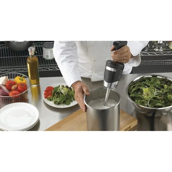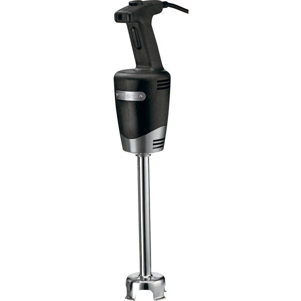 Immersion Blender, Capacity 9 gal, Horsepower 1/2 hp, Overall Width 5 in, Overall Depth 5 1/2 in, Overall Height 22 3/8 in, Blending Functions Emulsify, Puree, Whip, Number of Speeds 2, Voltage 120V AC, Maximum Speed 18,000 RPM, Wattage 350 W, Actuation Switch, Color Gray, Container Material Stainless Steel, Includes Sound Enclosure Not Applicable, Current 2.9 A, Features Rubberized Comfort Grip, Frequency 60 Hz, Includes 10 in Fixed Shaft, Product Type Immersion Blender, Standards cULus, NSF