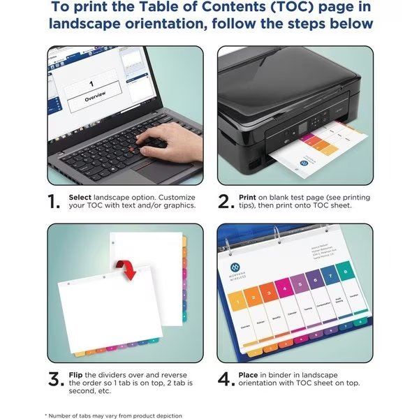 Index dividers offer a fast way to organize with impact. Extra-wide design is ideal for use with 9" x 11" sheet protectors. Coordinating system includes a reinforced Table of Contents page, matching preprinted tab dividers labeled from January to December, added tab reinforcement, double-sided hole reinforcement on tabbed dividers and paper made of heavy stock. 2-in-1 tab design let you pick between portrait and landscape formats. Simply print the section titles onto the Table of Contents page using your inkjet or laser printer. Tab dividers are also compatible with typewriters and copiers. Dividers are three-hole punched for use in binders. Avery offers many easy-to-use templates for Microsoft Word and other popular software programs.
