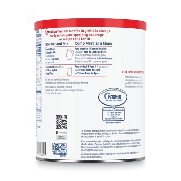 NescafE Carnation Instant Nonfat Dry Milk is an unsweetened nonfat dry milk fortified with vitamins A and D. It's recommended for use in the NescafE Krea Necta bean to cup specialty hot beverage equipment, but can be used in any NescafE specialty beverage machine as well as other specialty beverage equipment. NescafE Carnation Instant Nonfat Dry Milk makes a variety of specialty hot beverages including cafE lattes, cappuccinos, hot chocolate with milk, and French vanilla with milk. Each brew delivers a creamy end cup topped with delicious cream. Operators can also use this ingredient where any recipe calls for nonfat dry milk or follow package instructions for hand mixing milk. It is an excellent source of calcium and is certified Kosher dairy. Nestle Carnation Instant Nonfat Dry Milk is always ready when your specialty beverage or recipe calls for it.