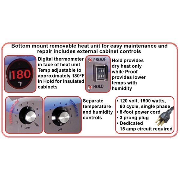 All aluminum construction. Extruded interlocking side panels provide 34 tray slides at 1.5" intervals. Bottom mounted heat unit is easily removable for cleaning and repair. Dual purpose cabinet - use for proofing or holding. Proof mode provides lower temperatures and humidity (use with distilled water only). Hold mode provides dry heat up to 180 degrees with insulated cabinets. 8 foot power cord with 3 prong plug requires 15 amp dedicated non-GFI circuit. 5" plate casters (2 with brakes). Ships fully assembled via truckline. ETL listed
