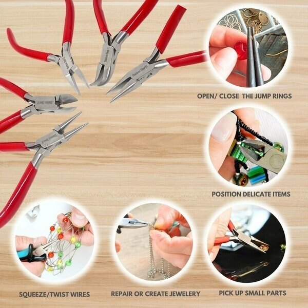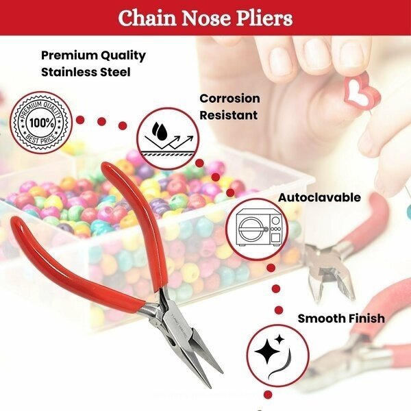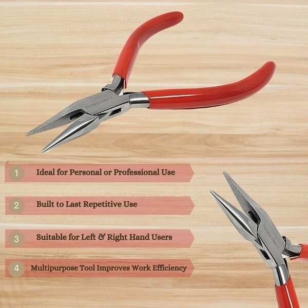 Premium Quality Material-Made from premium grade stainless steel, promising durability, long life span, and anti corrosion properties. Manufactured with a non stick, anti-glare surface and smooth finish.Comfort Grip Handle- Vinyl comfort grip handle provides optimal comfort and firm grip. It's optimum size and design is perfect for strenthening, crimping, opening, and closing jump rings, placing objects, and shaping loops in wires.Repair & DIY Crafts-Jaws are designed to be gentle on the thinnest wires allowing you to twist and bend materials without damaging the design. Commonly used to bend ring shanks, shape earring wires, construct intricate designs, gripping gems, and manipulating bead settings.Improves Work Efficiency-A user-friendly tool which is an ideal choice to improve work efficiency. Enables high degree of precision and flexibility for right and left hand users. Versatile & Functional-Durable and convenient to operate, these pliers are ideal for personal or professional use for a wide range of applications. Can be used to service electronics, assemble remote control cars, terrain or model airplanes.