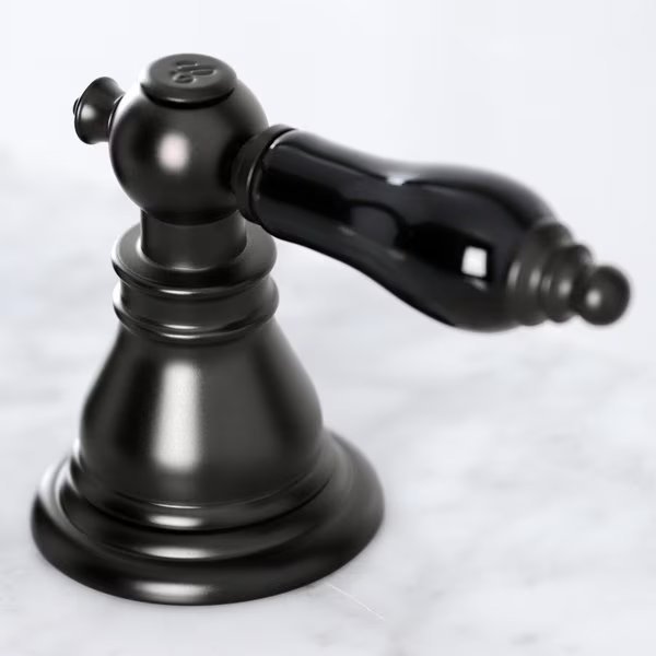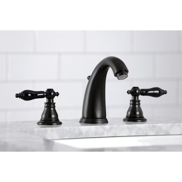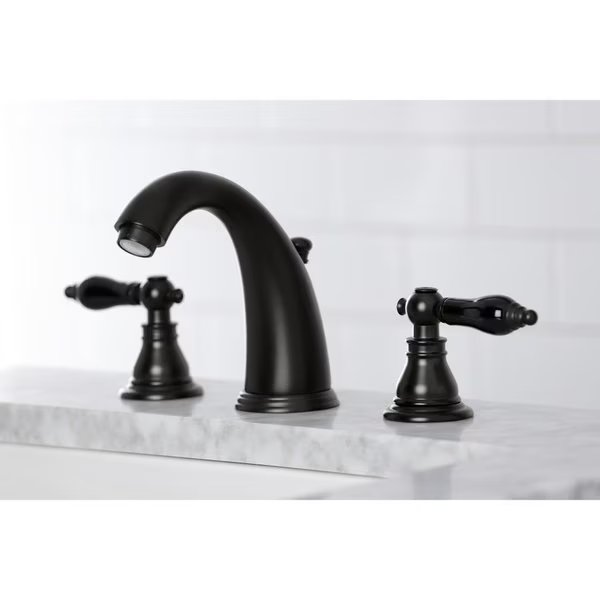 Crafted in commendations to English nobility, the exemplary design of this faucet manifests regality and elegance with its black porcelain handles. Ideal for more spacious bathrooms, widespread faucets are more spread apart and feature a 3-hole installation. The Duchess widespread bathroom faucet with plastic pop-up and its featured sturdy brass construction and premium matte black finish are guaranteed to glamorize your home's traditional ensemble for years to come. Glamorize your home today with the traditional elegance of this faucet. A matching finish drain is also included.