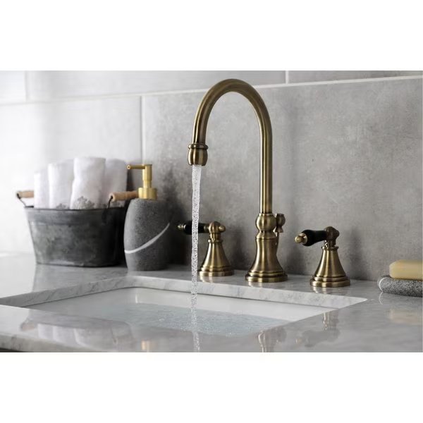 Crafted in commendations to English nobility, the exemplary design of this faucet manifests regality and elegance with its black porcelain handles. Ideal for more spacious bathrooms, widespread faucets are more spread apart and feature a 3-hole installation. The Duchess widespread bathroom faucet with brass pop-up and its featured sturdy brass construction and premium antique brass finish are guaranteed to glamorize your home's traditional ensemble for years to come. Glamorize your home today with the traditional elegance of this faucet. A matching finish drain is also included.