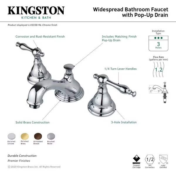 The exquisite design of this faucet tastefully flatters the elegant architecture of traditional homes with its fine detailing. Ideal for more spacious bathrooms, widespread faucets are more spread apart and feature a 3-hole installation. The Kingston Brass 8-inch widespread bathroom faucet with brass pop-up and its featured sturdy brass construction and premium oil rubbed bronze finish are guaranteed to glamorize your home's traditional ensemble for years to come. A matching finish drain is also included.