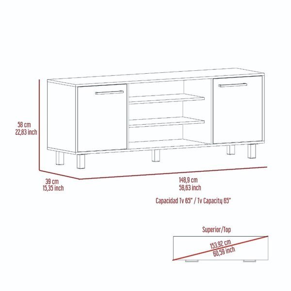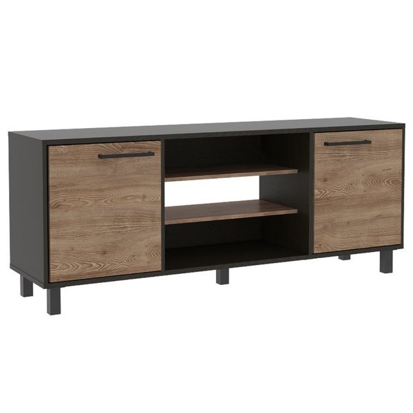 Part of the new exclusive collection, the Kaia TV Stand is perfect for those who want a stylish and functional piece of furniture for their living room. With its ideal size 58,63 in. W X 15,35 in. D X 22,83 in. H and designed with dark weathered oak cabinets and black metal legs, it provides a modern look that is both stylish and comfortable. The open compartments 15,39 in. H X 5,7 in. H X 5,39 in. H X 25,47 in. W provide plenty of storage space, while the top ideal for the TV with the capacity up 65 in. to complete the look.
