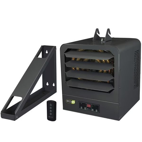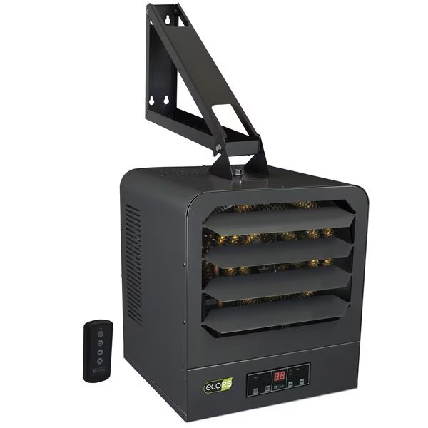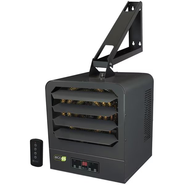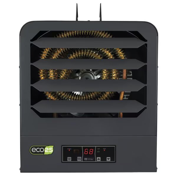The ECO2S KB series unit heaters offers unparalleled performance, energy efficiency and user control by incorporating another King innovation, the in-built ECO2S electronic thermostat with remote control. Offering energy efficient 2-stage heating, with Eco mode that automatically uses the lowest wattage needed to heat the room, integrated fan only and timer modes, as well as a remote control for simple operation. Designed for use as primary or supplemental heat sources in warehouses, stores or large garages spaces. Spiral steel elements and high CFM ensure even air distribution producing cooler element operation which prolongs the life of the heater. By combining the highest quality components, with a dynamically balanced fan blade, the KB ECO2S unit heater will provide years of trouble-free service and keep heating bills to a minimum. Includes universal wall/ceiling bracket for simple installation.
