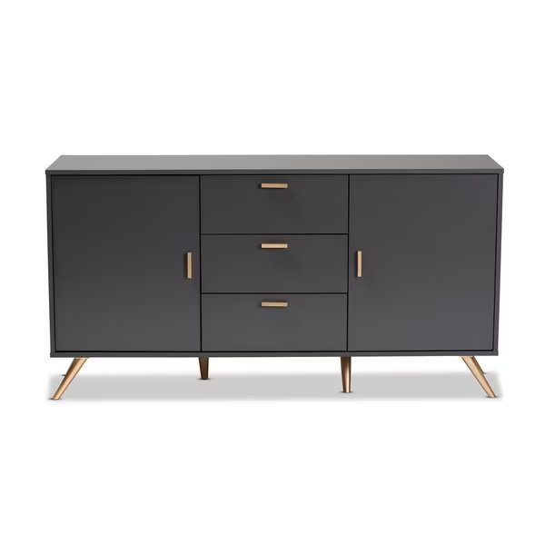 A tasteful expression of modern minimalism, the Kelson buffet is an impressive solution to dining storage. Made in Malaysia, the sturdy wood frame of the Kelson showcases a dark grey finish that exudes a cool, contemporary character. Three spacious drawers easily organize utensils, while four shelves behind the doors support larger cookware. Requiring assembly, the Kelson utilizes gold-tone angled legs for stable support with a luxurious touch. Gold handles add an eye-catching touch, making the Kelson buffet a refreshing addition to any space.