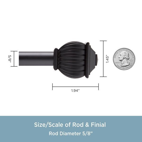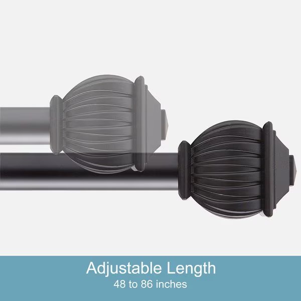The 5/8 inch diameter Beckett curtain rod in black features matching soft square shaped finial ends. Use in your kitchen, bedroom, dining room, and living room to hang light to medium weight curtains. The telescoping rod adjusts from 48 inches to 86 inches to fit your window and projects 3 inches from the wall. It is ideal for hanging curtains with pockets, grommets, back tabs, and tab tops, but can also be used with clip rings.