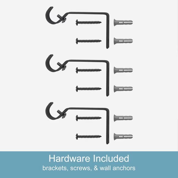 Drapery Hardware Set Includes: one telescoping steel curtain rod with decorative soft square finials (1.94" L x 1.45" W x 1.45" H), two mounting brackets, one center support, screws, drywall anchors, and installation instructions.