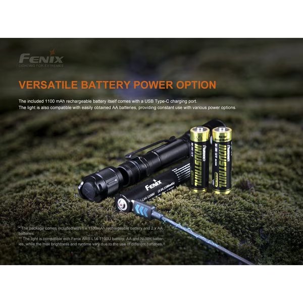 The LD22 v2.0 comes with a Fenix ARB-L14-1100U USB-C rechargeable battery, which can power the LD22 v2.0 for up to 220 hours on low.. When you need to recharge it, a USB-C cable is already included. Need to use the light while the battery is charged? LD22 v2.0 can also be powered by two easily sourced AA batteries. With the dual power options, the LD22 v2.0 is juiced up and ready to rumble whenever you need it.
