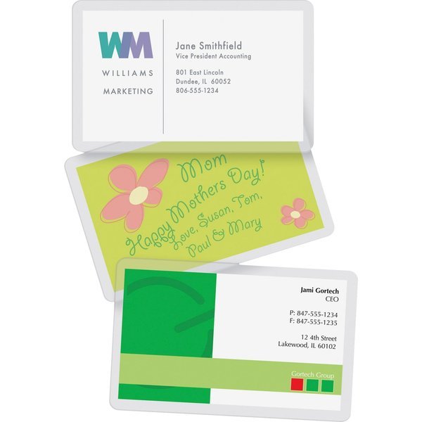 Laminating Pouch, Business Card, Length 2.25 in, Width 3 3/4 in, Clear Finish, Thickness 10 mil, Melting Temperature Range 250 Degrees F, For Use With Mfr Model No 5215801, 5215901, 5724501, 5727701, 5218601, 5727001, 5726301, and 5709501, Includes (100) Pouches, Package Quantity 100