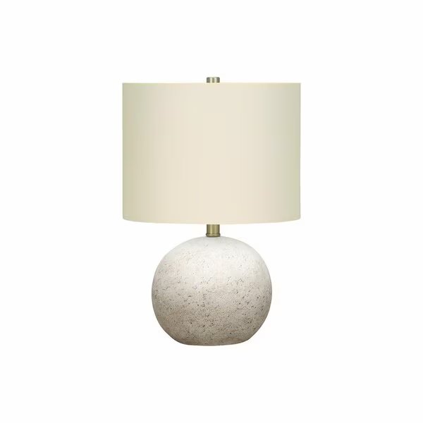 This stylish and fashionable 20h sphere shaped table lamp with a grey concrete base in a textured finish, and topped with an ivory linen drum shade and gold metal finial will be a standout accent to brighten any room. Featuring a 3-way rotary switch holding a single bulb not included with a maximum outage of 100W/120V, allows you to customize the ambiance in your living room, home office, or bedroom. With a chic contemporary appeal and attached with a 5ft clear cord, place this versatile decorative lamp on a side or end table, or on your nightstand or bedside table to create a warm and inviting atmosphere._x000D__x000D_