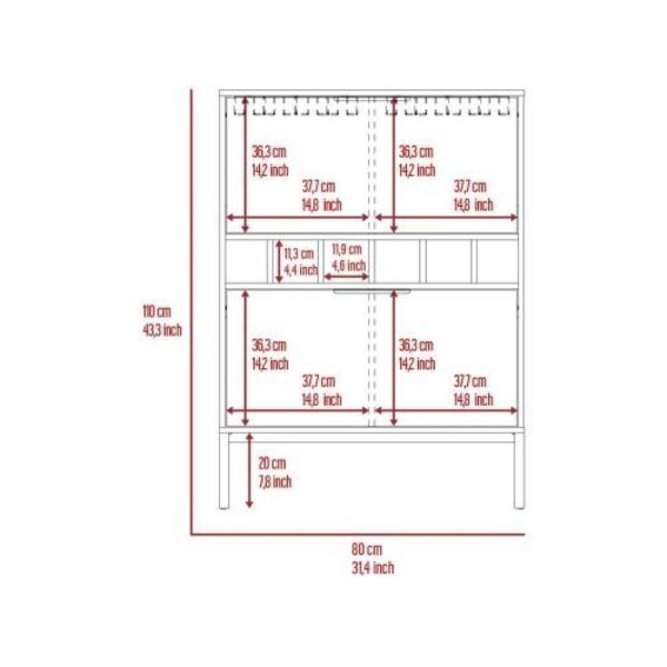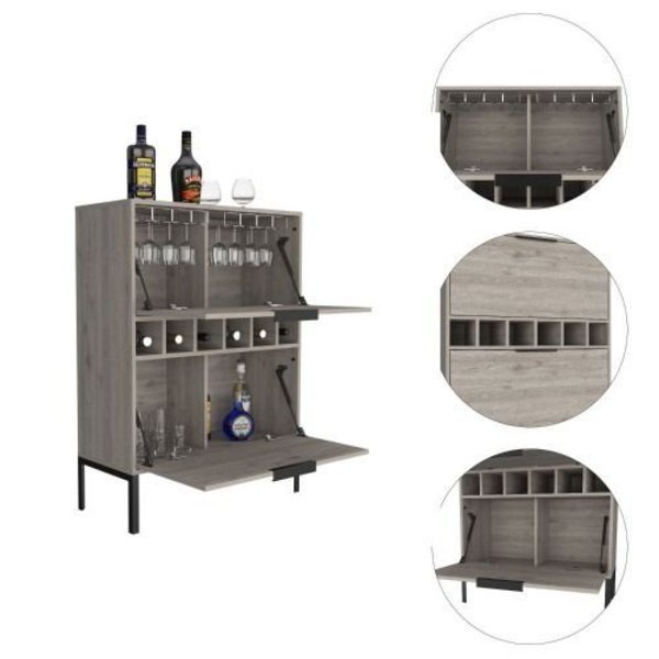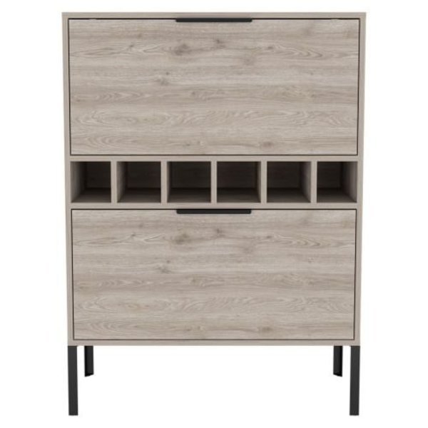 This exclusive product is the ideal complement to create your bar at home, with ample storage capacity for all your favorite drinks, including your glasses.If you are an excellent wine lover and cocktails, this is a perfect option, with six Built-in Wine Rack4,4 in. H X 4,6 in. W perfectly to preserve your wine. The other compartments are unique for your implements.Its size 43,3 in. H X 31,4 in. W X 13,7 in. D is perfect for the modern touch with the elegant steel legs7,8 in. H X 31,4 in. W and Light Gray manufactured wood finish.