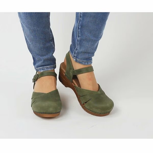 Waxed leather closed-toe professional sandal. Rocker Bottom. APMA approved. Adjustable strap with buckle. Anatomically correct footbed with microfiber insole