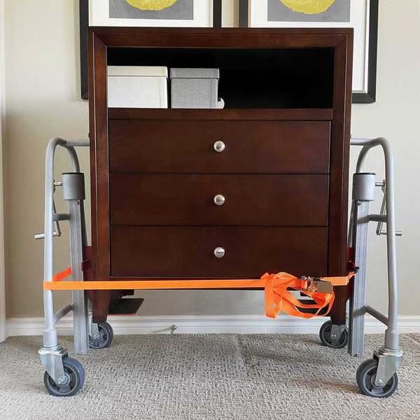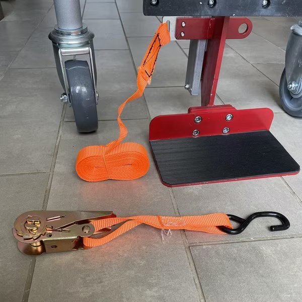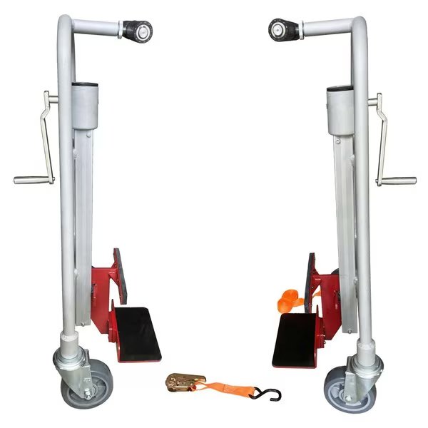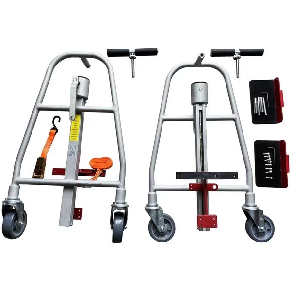 Pake Handling Tools - Manual Machinery Mover are design for use safe, easy lifting and transportation of large, bulky loads. This 2 piece dolly set can lift 1100 lbs and 12 inch height, , and each unit is equipped with lifting platform, bevel gear, operation handle, support frame and moving frame, casters, and all mounting hardware. The nylon straps and ratchet mechanism keep the load in place. Strap length: 116". 9'' X 4.72'' lifting plates. Overall dimensions 23" L x 15" W x 35" H
