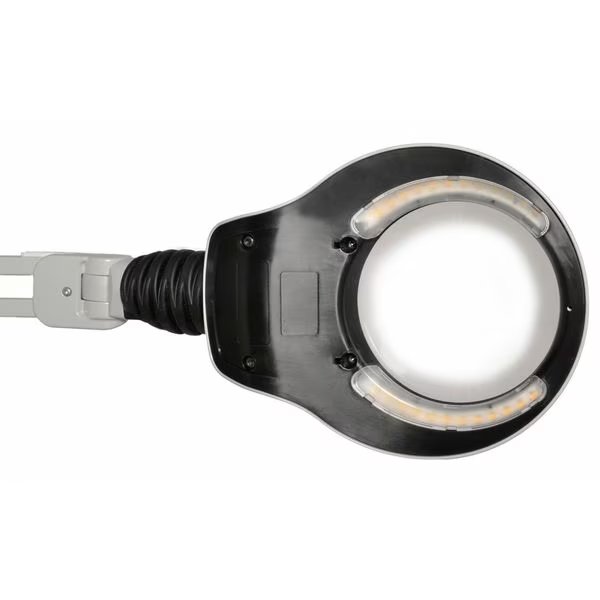 Round Magnifier Light, Arm Design Articulating, Arm Reach 45 in, Clamping Capacity 3 in, Color Gray, Color Rendering Index 80, Color Temperature 4000K, Diopter 3, Lens Diameter 5 in, Lens Material Glass, Lens Shape Round, Lighting Technology LED, Magnification 1.75x, Maximum Brightness 900 lm, Mount Type Clamp On, Operating Voltage 120V AC, Includes Ultraviolet Light No, Application Industrial, Arm Material Steel, Dimmable Yes, ESD Safe No, Features Auto Shut-Off, Focal Length 13 in