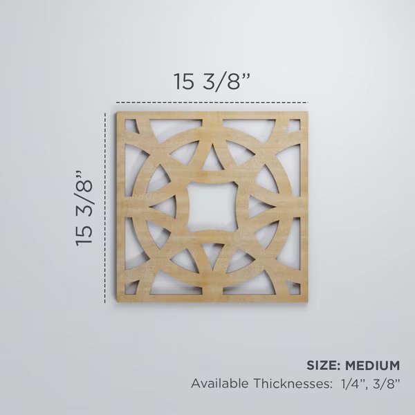 Available in paint-grade, oak, cherry, alder, walnut, hickory, and birch allowing for great strength and durable usage. The natural wood tones evoke luxury and sophistication in any space. You can leave your design mark with unique and inspiring effects on your walls, cabinetry, ceilings and more. Our easy-to-install wood panels can turn a room into a work of art in no time at all. Our distinctive wood fretwork panels add instant value to your home and stand apart from everything else on the market.Assembled Dimensions: 15 3/8"W x 15 3/8"H (covers 1.64 square feet per panel)