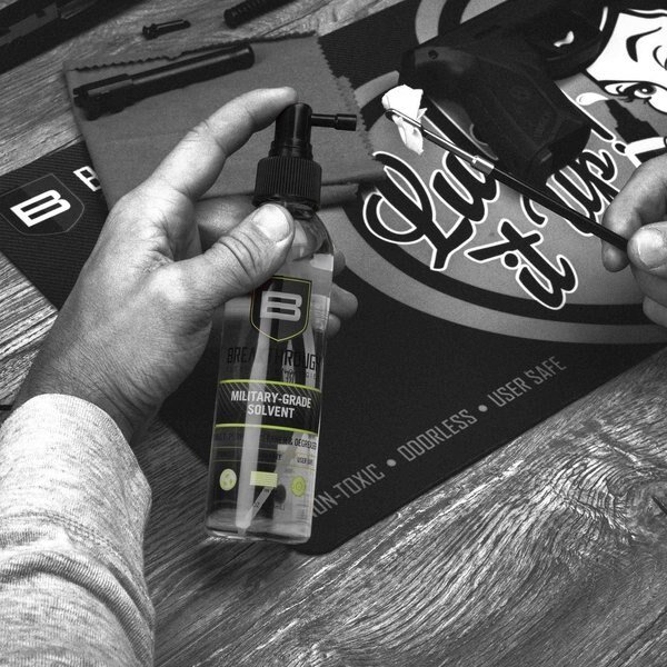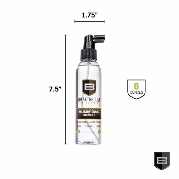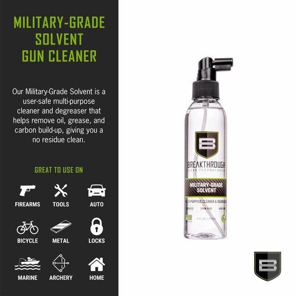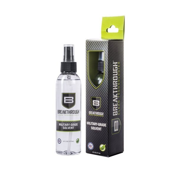 Our Breakthrough Clean Technologies Military-Grade Solvent is a user-safe multi-purpose cleaner and degreaser that helps remove oil, grease, and carbon build-up, giving you a no residue clean. Unlike other aromatic cleaners, our odorless formula allows you to clean indoors without having to deal with noxious and unpleasant fumes. Breakthrough Clean Technologies Military-Grade Solvent cleans quickly and efficiently while reducing the frequency needed between cleanings. It will not stain your wood, plastic, or polymer components and is also safe on Cerakote and hydro-printing. Breakthrough Clean Technologies Military-Grade Solvent is a benzene-free, HAP-free, state-of-the-art solvent designed to help users break out of the tangle of regulations regarding emissions, disposal, and industrial health hazards. Our Breakthrough Clean Technologies Military-Grade Solvent is an odorless, low toxicity, high-purity hydrocarbon that exhibits a very low degree of irritancy to the eyes and is non-irritating to the skin. It has a low vapor pressure to control Volatile Organic Compound VOC emissions, is non-carcinogenic, and is not regulated under SARA, Title III, Sections 302 or 313, CERCLA, and RCRA requirements. Breakthrough Clean Technologies Military-Grade Solvent has no listed components and characteristics of hazardous waste per the EPA. GUN CLEANING SUPPLIES: The Military-Grade solvent is a multi-purpose cleaner & degreaser for removing oil, grease, & carbon build-up in your guns. There are no unpleasant fumes, & it will not stain your wood, plastic, or polymer components. SOLVENT CLEANER: Clean your guns efficiently while also reducing the frequency needed between cleanings. Our various sized spray bottles are a fast maintenance solution for removing carbon build up, & it leaves no residue behind. FIREARM CLEANING SPRAY: Our premium gun solvent cleaner, along with our gun oils, will help keep your guns in peak condition & top-notch performance. It has low vapor pressure & will not freeze when you pack it away with your firearm accessories. MULTI-PURPOSE CLEANER & DEGREASER: Our solvent is safe on your firearm's wood, plastics, polymers, Cerakote, & hydro-printing. Other uses include: knives, fishing reels, brakes & automotive, boats & marine, & other tools.