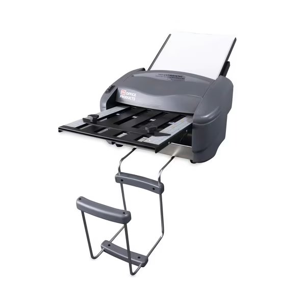 The P7500 Paper Folder is ideal for use in small mailrooms, offices, churches, and more. Its small and convenient size is perfect for desktop placement. It is capable of folding 8.5" x 11" and 8.5" x 14" papers into four different fold types: Half Fold, Letter Fold, Z-Fold, and Double Parallel. Sets of one to three sheets are automatically folded when hand-fed. It is also capable of folding stapled sets. Feed tray holds up to 50 sheets. This easy-to-use paper folder can fold up to 4,000 sheets per hour, handling sheet weights of 18 lb to 24 lb bond paper.