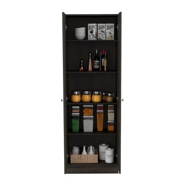 Add expansive storage space to any area of your home without taking up too much square footage, thanks to the TUHOME Free Standing 5-shelf Multistorage Cabinet. It features 5 deep, fixed shelves behind a pair of doors, making it ideal for organizing all your dry goods in a single place. Use it in your kitchen or bedroom as a handy wardrobe for casual clothes, in the garage for gear storage, or in the bathroom as a linen closet. The storage organizer cabinet is crafted from lightweight wood laminate with a bright espresso/ black finish, accented with polished metal hardware and hidden hinges. Tall and slim, adding this cabinet to any corner or adjacent to your existing fixtures is easy. Its crisp espresso/ black finish emphasizes the modern lines and easily complements any style of decor. Unclutter your life with the TUHOME Free Standing 5 Shelf Wood Pantry Multistorage Cabinet.Its size 23,6 in. W X 11,8 in. D X 70,8 in. H fits perfect in any room. Includes Single Door cabinet with five internal shelves 22,0 in. W X 12,9 in. H 11 lb max suggested load capacity