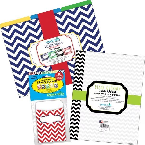 Barker Creek's Chevron Nautical OnTrend Organizer set contains three of their best selling products Included are 12 multidesign lettersized file folders, 50 sheets of coordinating paper, and 30 multidesign peel stick library pockets The LetterSized File Folders that are an affordable way to organize your office, classroom, and home with style and flair Each set includes 12 file folders three each of four beautiful designs The folders are 13 tabbed which, in file folder lingo means they have three tab positions four folders are tabbed on the left, four are tabbed in the center and four are tabbed on the right Fully reversible, each folder has a colorful design on one side and a vibrant, solid color on the reverse side perfect for making file folder games and lapbooks Additionally, they are great for everyday filing needs, presenting meeting handouts, organizing important papers, sending work home with students, storing treasured photos and archiving other significant mementos Use the computer paper to add a memorable touch to letters, design custom awards and certificates, add an extra wow to presentations and reports, create gorgeous invitations, make stunning bulletin boards, and so much more There are fifty 8 12 x 11 sheets of decorative paper which is compatible with most laser printers Each set also includes 30 peel stick library pockets six each of five beautiful designs Each of them has a 'label on the front so you can easily write names, add index cardflash card descriptions, organize recipe cardsand so much more The Library Pockets are great for organizing flash cards, hall passes, file folder game pieces, spelling word lists, library cards, reading logsand more Each pocket has two selfadhesive peel stick strips on the back making them easy to adhere to file folders, binders, charts, signs, hallways, and doors Coordinating products available Search Barker Creek Chevron