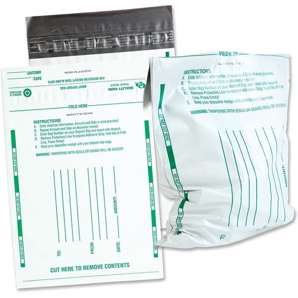 Night Deposit Bags are designed to protect deposits from pilferage. Durable, opaque, polyethylene material prevents viewing of contents. Pre-printed information blocks make them easy to label with prompts for recipient, sender, date and amount. Recyclable bags features a tear-off receipt for easy tracking.