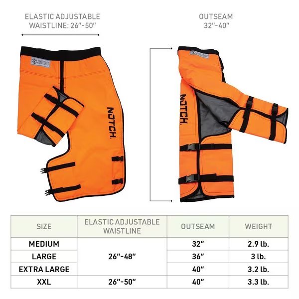 New Notch Chainsaw Chaps Full Calf Wrap have an innovative lightweight 5 layer chain stopping protective fiber (79% Polyester, 21% Polypropylene) blend. Great chainsaw protection at a great price!