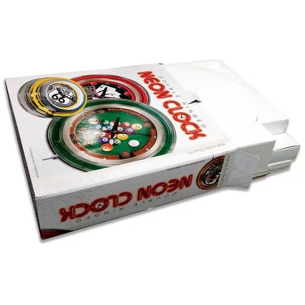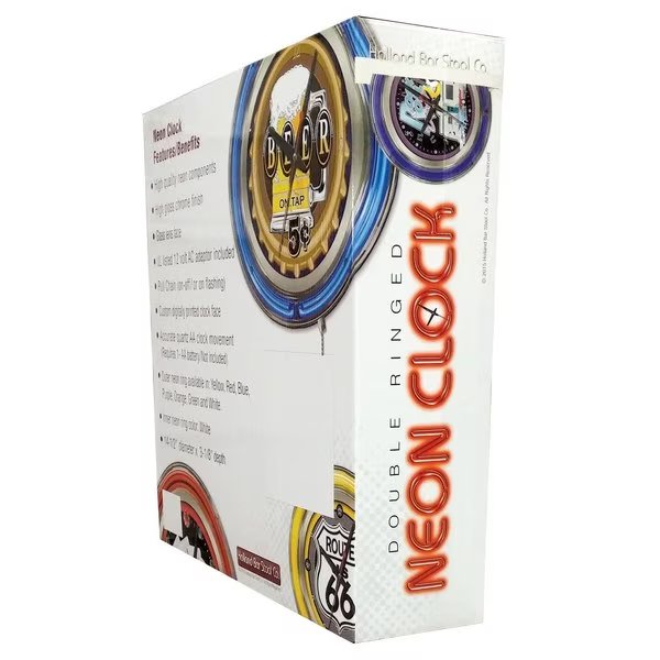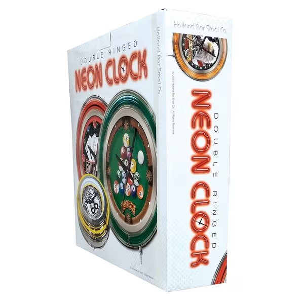 Our double neon Logo Clocks are the perfect way to show your school pride. Featuring a chrome casing and a team color specific neon outer ring that accents the custom printed clock face which is lit up by an brilliant white, inner neon ring. The Neon rings are easily turned on and off with a pull chain on the bottom of the clock, and are powered by a UL Listed power transformer that runs off standard 120V outlet. Accurate quartz movement ensures proper time and is powered by a single, AA battery (not included). Whether purchasing as a gift for a recent grad, sports super fan, or for yourself, you can take satisfaction knowing you're buying a clock that is proudly made by the Holland Bar Stool Company.