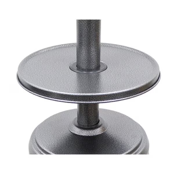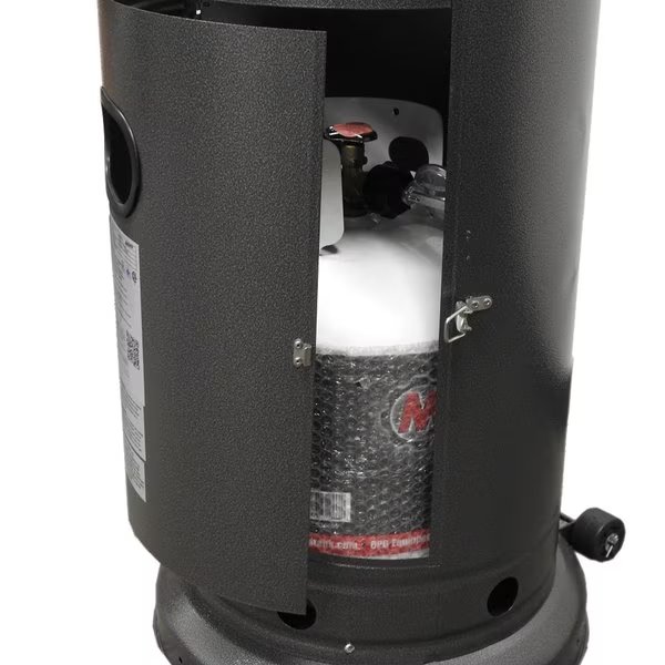 When the cool evenings come, dont stop your outdoor activity. This beautiful hammered silver outdoor propane heater is all that you need to keep entertaining outdoors year round. Not only does this tall outdoor heater emit 48,000 BTUs of warmth in a 10-15 diameter, it also provides you with an extra table for your patio area. Steel construction ensures that this unit is durable as well as functional. This patio heater includes thermcouple and anti-tilt safety devices, an easy access tank housing door, and wheels for easy mobility.