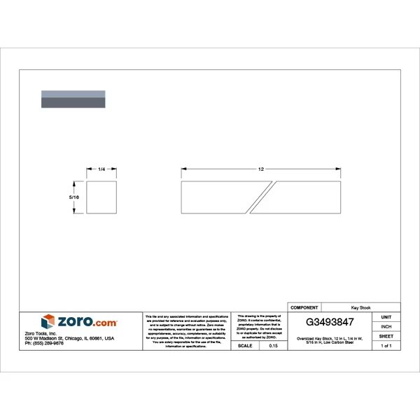 Key Stock,12 in L,Steel,5/16 in W, System of Measurement Inch, Material Steel, Material Grade/Class Grade 1018/Grade 1045, Finish Zinc Plated, Height 1/4 in, Thickness Tolerance +0.003/-0.000 in, Length 12 in, Length Tolerance +0.000/-0.125 in, Width 5/16 in, Width Tolerance +0.003/-0.000 in, Pack Size Small Pack, Made in North America Yes, Properties Corrosion Resistant, Key Shape Straight, Rockwell Hardness HRB 50, Features Magnetic, Tensile Strength 64,000 psi
