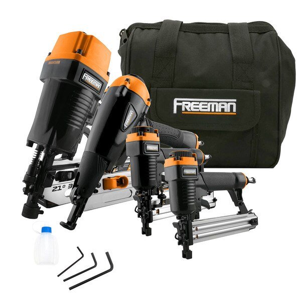 The Freeman P4FRFNCB Pneumatic Framing and Finishing 4-Tool Combo Kit with Canvas Bag is an essential set of tools for professional construction contractors at the job site as well as DIYers tackling home improvement and repair projects. This collection of air powered nail guns and a stapler covers your framing to finishing needs and includes a 21 Degree 3-1/2" Full Round Head Framing Nailer (PFR2190), 15-Gauge 34 Degree Angle 2-1/2" Finish Nailer (PFN1564), 18-Gauge 1-1/4" Brad Nailer (PBR32), and 18-Gauge 1-1/4" Narrow Crown Stapler (PST9032). The powerful Framing Nailer is specifically designed for tasks such as framing, sheathing, truss assembly, roof decking, subfloors, fencing, furniture, and assembling pallets and shipping crates. This durable nail gun features a one piece drive blade made of hardened steel and a lightweight magnesium body. Put the Finish Nailer to work on door and window casing, moulding, trim, chair rails, cabinetry, and other fine finish applications. The 34 degree angle of the magazine makes it easy to access corners or tight spaces, and the dual mode trigger allows to easily switch between sequential or bump firing. When the focus is on accuracy, use the sequential mode. When speed is the name of the game, engage the bump fire option and get to work. The Brad Nailer is ideal for interior and exterior finish and trim, furniture, cabinetry, picture frame assembly, and hobbies and crafts. An oil-free design eliminates the need for regular maintenance and prevents stains on your work surface. The Narrow Crown Stapler is perfect for projects such as decorative trim, cabinetry, cabinet backing, and hobbies and crafts. The no mar safety tip prevents damage to your work surface, ensuring professional results. A canvas carrying bag, air tool oil, and adjustment tools are included. The Pneumatic Framing and Finishing 4-Tool Combo Kit with Canvas Bag will allow you to complete a wide variety of home improvement and repair projects quickly and easily