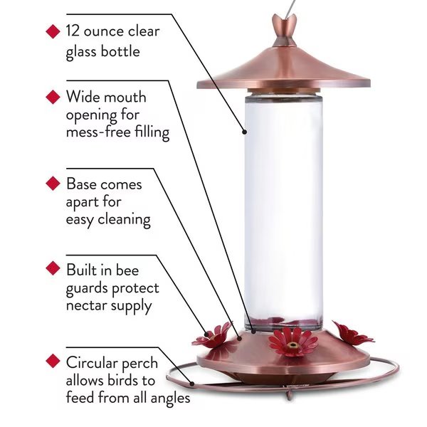 With the Perky-Pet Elegant Copper Glass Hummingbird Feeder it’s all about the details! It has a beautiful eye-catching design that is as stylish as it is functional. The attractive brushed copper-finish and striking crystal-clear glass are sure to captivate you as well as your hummingbird visitors. Once they stop to visit the 12 oz nectar capacity will keep them satisfied. With four feeding ports and a 360-degree perch the Perky-Pet Elegant Copper Glass Hummingbird Feeder will easily accommodate multiple hummingbirds at the same time. Plus the ports’ flower-shaped design and bold red color is sure to catch the attention of hummers as they pass by. Meanwhile built-in bee guards defend against unwanted insects. To ensure ease of filling this attractive feeder is designed with a convenient wide-mouth bottle. The larger opening will reduce the risk of messes and spills as you pour nectar into the bottle. In addition the wide-mouth bottle makes it easier to clean. The base also comes apart so you can access all the nooks and crannies. Lastly use the built-in hanging cord to place this gorgeous feeder anywhere around your yard garden or patio.