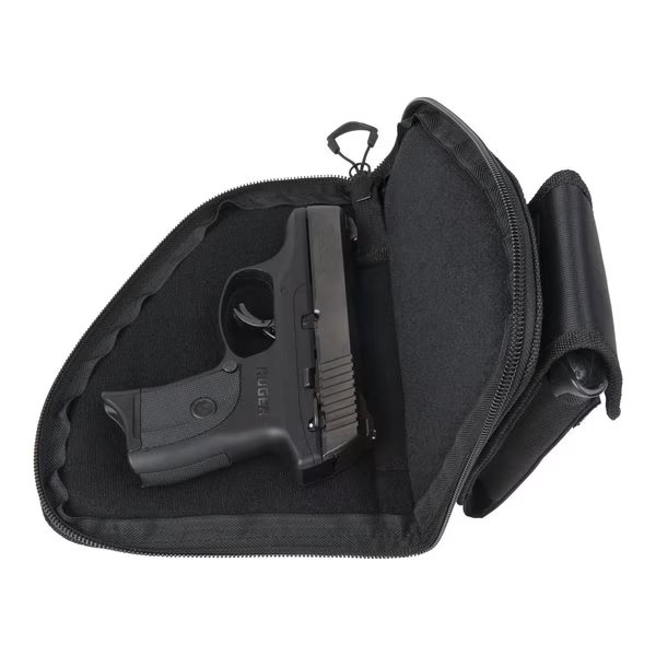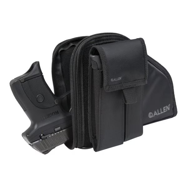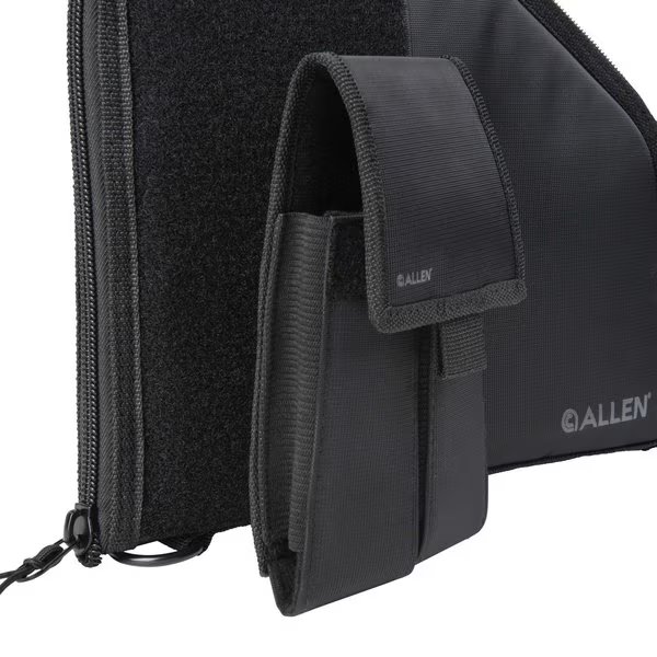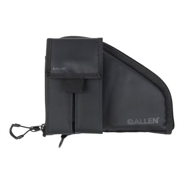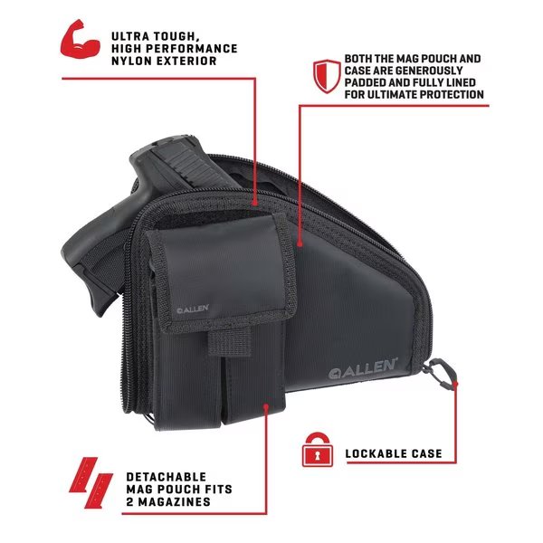 The Allen Company Pistol Case, with mag pouch, provides you with a high-performance, lockable design to keep your handgun protected against the elements or while in transport. Pistol case fits compact handguns up to 8-inches and comes with a detachable mag pouch, fitting up to 2-magazines. High performance, ballistic nylon exterior, with soft brushed interior, helps keep your investment, and mags, safe and secure. Both the case and mag pouches are fully lined and padded for complete protection. DETACHABLE MAG POUCH: Case provides a detachable mag pouch, allowing you to add magazines or remove the pouch & use as a standalone mag pouch-fits up to 2-magazines. COMPACT HANDGUNS: Pistol case fits compact handguns up to 8-inches long & offers an ultra-tough, high performance ballistic nylon exterior, with soft brushed interior, to keep your firearm safe & protected. LOCKABLE HANDGUN CASE: Gun case is lockable for additional security when you need it while a hanging loop enables you to keep your case off the ground & protected from the elements. ULTIMATE PROTECTION: Both the mag pouch & case are generously padded & fully lined for complete protection.