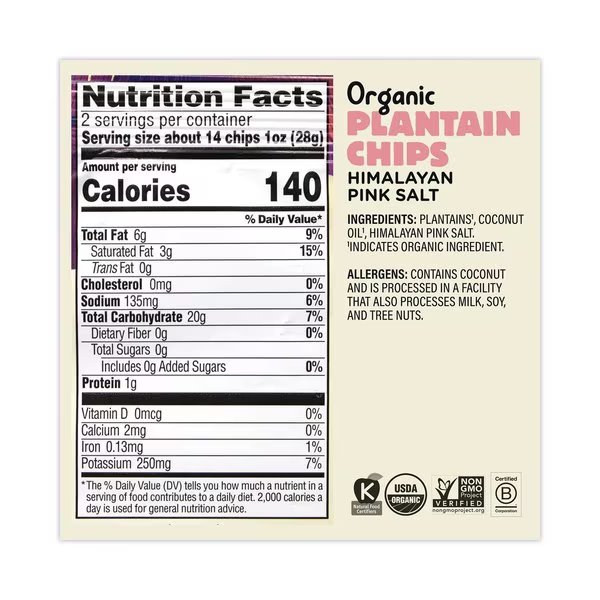 Barnana Organic Plantain Chips in pink sea salt and Acapulco lime flavor are perfect combination of salty and sweet. Ingredients are simple and a healthy alternative to traditional potato chips. Ideal for kids' lunches, or snacking on-the-go.