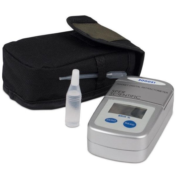 These lightweight, compact pocket refractometers are ideal for determining Brix concentrations in fruits and beverages as well as cutting oils and organic samples. They measure concentrations in brix, salinity and a wide variety of other parameters in the field with laboratory accuracy. These handheld refractometers are small, light and simple to use as optical refractometers, but with the precision of a digital readout. They read samples as small as 1 ml. Sample temperature is initially displayed on the large LCD followed by the measurement results. They have easy-to-read LCDs that eliminates the possibility of interpretation errors. The sophisticated microprocessor provides automatic calibration, automatic temperature compensation ATC and automatic shutoff after 3 minutes. A sturdy water resistant case protects the electronics from wet environments and makes for easy clean ups. All models feature one button calibration to distilled water and indicate when the battery should be replaced 8000 readings. They come ready to use with distilled water, transfer-pipet, AAA battery, instructions and a carrying case.Brix refractometers, which are also called sugar refractometers, are commonly used in the food and beverage, agriculture and wine industries. Fruit farmers will use a refractometer to check the sugar content of fruit on the vine to determine the best time for harvesting. Sper Scientific handheld sugar – brix refractometer is an ideal measurement instrument for the food and beverage industry. We can create digital refractometers with custom scales according to your data or requirements for a minimum order of 100 units.Dimensions: 4 × 2 × 11⁄4 118 × 62 × 32 mmWeight: 4.6 oz 130 g Specifications Model Unit of Measure Range Resolution Accuracy 300051 Brix 0 to 65% 0.2% ±0.2% 300052 Brix 40 to 88% 0.2% ±0.2% 300053 Brix 0 to 88% 0.2% ±0.2% Downloads Instruction Manual Product Brochure Comparison Chart Comparison Chart Videos