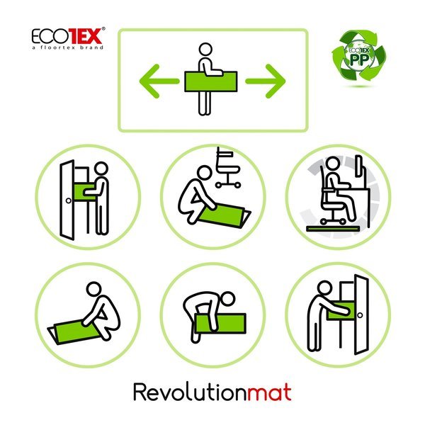 Floortex Ecotex Revolutionmat Polypropylene, Rigid top surface with low roll resistance for a "easy-glide" chair movement. Ecotex polypropylene mats are guaranteed not to crack, chip, cup or shatter under normal use and correct application. Compatible with under floor heating systems. Not sensitive to alkali-based cleaning products used at their manufacturer-recommended concentrations. Quickly unfolds for instant use. Also ideal for easy storage and lifting when cleaning of flooring underneath. Easy and effective recycling properties for end-of-life re-use. Odorless and toxin free. BPA, PVC, tin, lead and cadmium free. Manufactured to ISO-9001:2000, EN 425:2002 and EN 423:2001 standards.
