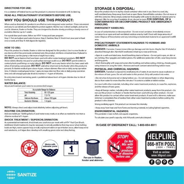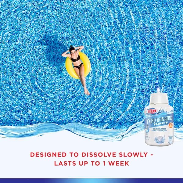 HTH Pool Care 1 in. Chlorine tablets are a simple convenient way to keep your pool water clean and clear. Simply place tab(s) into the skimmer basket floater or feeder to sanitize and protect your pool water from algae and bacteria. HTH Chlorinating Tabs are great for all pool types including small pools pop-up and above-ground pools vinyl-lined pools as well as salt water systems.