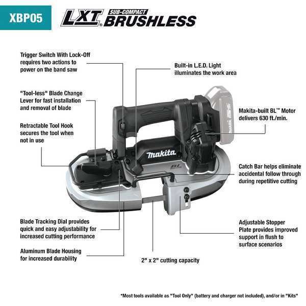 Portable Band Saw, Voltage 18 V, Cordless Tool Kit Contents Bare Tool, Blade Length 28 3/4 in, Round Cutting Capacity 2 in, Rectangular Cutting Capacity 2 in x 2 in, Number of Speed Settings Continuous, Charger Included No, Brushless Motor Yes, Number of Batteries Included 0, Battery Series 18V LXT, SFPM Range 0 to 630, Drive Type Worm Drive, Handle Type D-Handle, Tool Length 14 3/4 in, Tool Weight 7.3 lb, Cordless