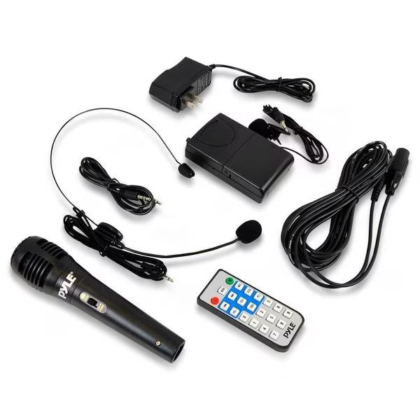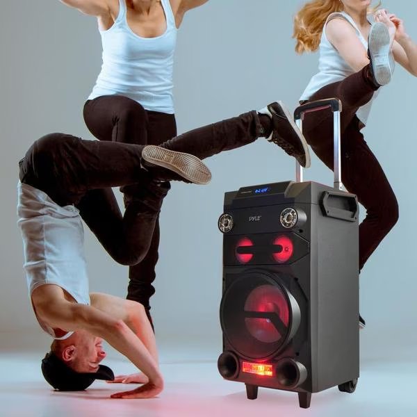 Features: - Karaoke & Music Streaming Speaker System - Compact, Portable & Powerful - Bluetooth Wireless Audio Streaming - Built-in Rechargeable Battery - Flashing DJ Party Lights - FM Radio with Digital LCD Display - USB Flash & Micro SD Memory Card Readers - MP3 Digital Audio File Compatibility - Includes Handheld Wireless Microphone - Audio File Recording Function - Headphone Jack - Aux (3.5mm) Input - Microphone Input - Connect & Stream From External Devices - Full Range Stereo Sound Reproduction - Impressive Bass Response - Convenient Carry Handle & Rolling Wheels - Rugged & Heavy Duty Design - Top Panel Button Control Center Bluetooth Connectivity: - Built-in Bluetooth for Wireless Streaming - Works with All of Your Favorite Devices - (Smartphone, Tablet, Laptop, Computer, etc.) - Bluetooth Network Name: 'PyleUSA’ - Bluetooth Password: '0000' - Bluetooth Wireless Range: 65'+ Ft. - Bluetooth Version: 2.0 Audio Recording: - It's Easy: One Button Recording Activation - Record Audio as Streamed through the Speaker System - Ability to Record Vocals via Microphone - Records to USB Flash or Micro SD Card - Audio File Type Created: .MP3 - Easy Transfer to PC & Mac What's in the Box: - Portable PA Speaker - Wired Handheld Microphone - Headset Microphone - Lavalier Microphone - Audio (Aux) Connection Cable - Power Adaptor - Remote Control Technical Specs: - Power Output: 550 Watt MAX - Sound System: 8'' Subwoofer - Wired Microphone Cable Length: 16.5’ ft. - Battery: Lead Acid, 3500mah 11.1V - Impedance: 4 Ohm - Sound Distortion: <1.0% - S/N Ratio: =85dB - Max USB/SD Memory Card Support: 32GB - Power Supply: 100/240V (DC 12V Power Adapter)