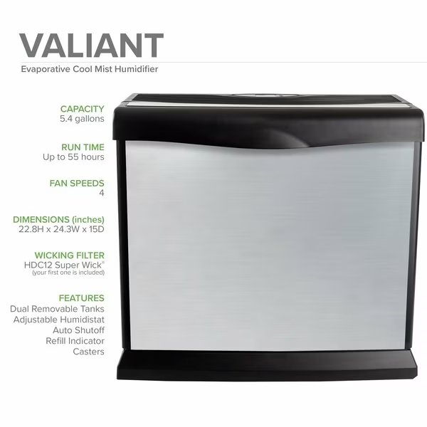 Portable Humidifier, Console, Max. Square Foot Capacity 4,000, Voltage 120 V AC, 2.8 A Amps AC, 165 Watts, Height 22 3/4 in, Width 24 1/4 in, Depth 15 in, Max. Runtime 55 hr, 5 gal Water Reservoir, Drain Type Dual Bottles, Number of Speeds 3, Replacement Wick HDC12, Wick Treated With Antimicrobial, Cord Length 60 in, NEMA Plug Configuration 1-15P, Color Brushed Nickel