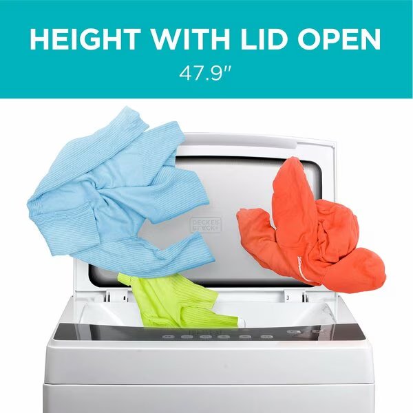 WASH UP TO 11 LBS.Wash up to 11 lbs. of laundry at a time with this superior BLACK+DECKER best portable washer. Our portable clothes washer 21.3 x 21.7 x 36.6 has 6 cycle selectionsNormal, Heavy, Delicate, Quick, Bulky, and Spin Only. Even suitable for baby clothes, diapers, and lingerie.IMPRESSIVE FUNCTIONALITYWith your new washer machine 70.5 lbs. you have 3 water level choices for small, medium, and large loads as well as Hot, Warm, and Cold temperature settings. You can even select Delay Start up to 24 hours.STAINLESS STEEL TUB This 1.7 cu. ft. portable washing machine features a durable, rust and corrosion-resistant stainless steel tub with top loading transparent quiet close lid. See your clothes cleaned in real time with our outstanding impeller washer!ADDITIONAL FEATURESThere's a lot going on with our amazing washing machine, including auto unbalance detection to ensure your laundry is being cleaned at peak performance. as well as auto shutoff safety features and child lock protection.DESIGNED FOR MOBILITY This fantastic portable clothes washer machine can easily be transported from room to room thanks to two rollers, two side handles, and adjustable leveling legs. Also included with our compact washer is a connector adaptor, water supply hose, and drain hose.