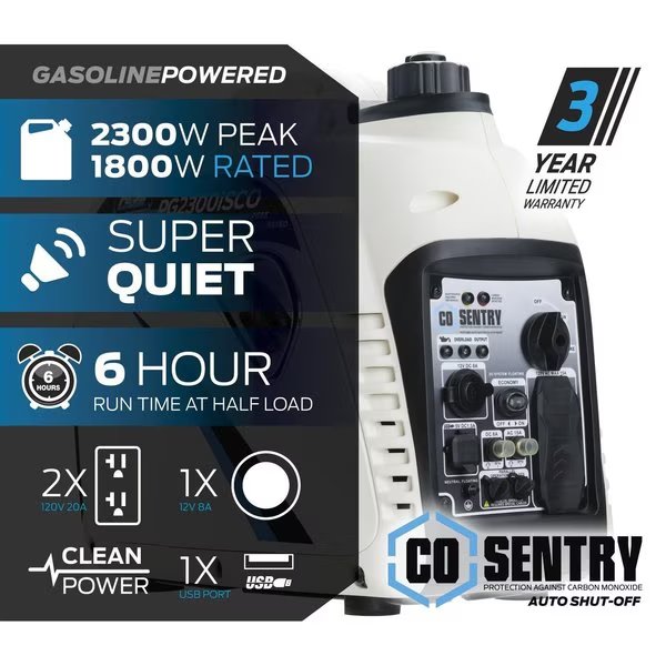 Pulsar's 2,300 Watt Portable Inverter Generator is an excellent choice for those who require clean power for their sensitive electronics. Its versatile design makes it ideal for a range of uses, such as camping, tailgating, home backup, and DIY projects. This small portable generator features an 80cc, 4-stroke, OHV engine that produces 2,300 peak watts and 1,800 running watts of power while maintaining a virtually silent operation - rated at only 59 dB. With parallel capability, you can double your power output by running two generators simultaneously without the inconvenience of a much larger unit. The suitcase design is both compact and durable, weighing only 47 pounds and equipped with an easy-to-carry handle, making it effortless to transport. The 1.18-gallon fuel tank offers up to 6 hours of operation at half load, and the stable sine wave technology allows you to power sensitive electronics safely. This inverter generator is equipped with a carbon monoxide sensor, which shuts down when excess CO is detected, providing additional protection for your safety. The generator also features a low oil indicator and low oil shut-off, ensuring that it shuts down when the oil level is low as well. Economy mode improves fuel efficiency, and automatic voltage regulation ensures that the generator runs smoothly. This super quiet generator is RV and campsite friendly, making it an excellent choice for outdoor activities. Overall, Pulsar's 2,300 Watt Portable Inverter Generator is a reliable and versatile solution for your power needs.