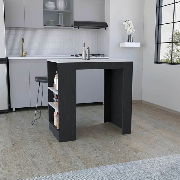 The Portree Kitchen Island is a versatile and functional piece of furniture that will elevate any kitchen. Available in white/macadamia or black/Ibiza marble finishes. this kitchen island is made from high-quality manufactured wood that is durable and easy to clean.One of the standout features of this kitchen island is its ample superior top. which measures 23.2in.D X 36.2in.W. This makes it the perfect size for a dining table. providing a convenient and stylish space to enjoy meals with family and friends. In addition to the superior top. the Portree Kitchen Island includes three side shelves ideal for storing your cooking supplies. spices. and other kitchen essentials. This keeps everything within reach while cooking. making meal prep a breeze.Dimensions:Height: 35.9in. Width: 36.2in.Depth: 23.2in.Furniture Type: Ready to assemble full assembly required.Certifications: CARB phase II compliant - TSCA Title VI Compliant.