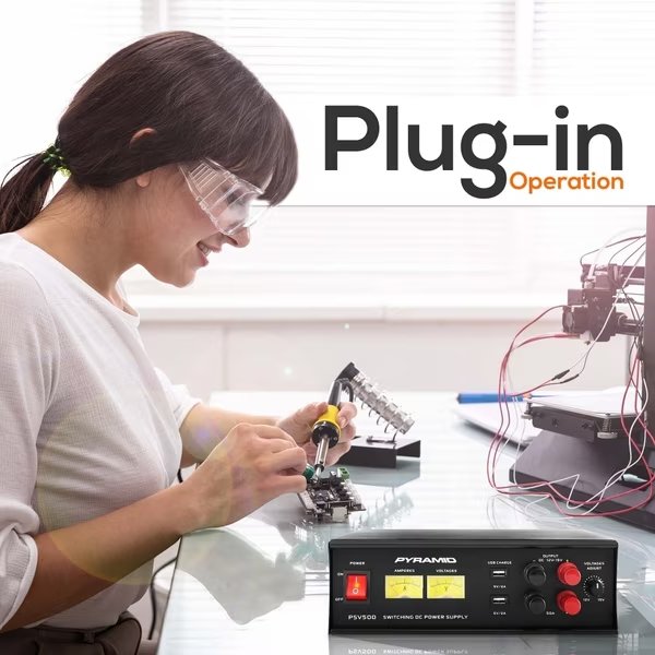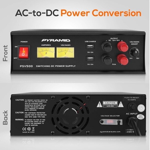 Features: - Linear / Regulated Power Supply Design - AC-to-DC Power Conversion - Provides Constant Source of DC Voltage - Simple Electronic Plug-in Operation - Hassle-Free Dual Screw Terminal Connectors - Eliminates the Need of Battery or External Power Source - Analogue Gauge Amperage & Voltage Metered Display - Rotary Control Voltage Level Adjustment - Built-in Cooling Fan - LED Backlit ON / OFF Switch - Fuse Protected with Auto-Reset - Home Desktop Workstation Power Supply Style - Electronic Overload & Short Circuit Protection - Rugged & Durable Housing Construction, Cabinet Heatsink - Used for Component & Device Equipment Testing, Operation & Performance - Pyramid Compact Hobby Power Supplies Safe for Tabletop Placement Technical Specs: - Continuous Power: 50 Amp, Max. - Adjustable Voltage / Power Output: 12-15V DC - Recommended Wire Cable Size: 14 (AWG) Gauge - Output Voltage Accuracy: +/-0.02% Volts - Ripple Output: 150mV - Fuse Overload Protection: 8A/250V - USB Power: 5V/2A (x2) - Power Supply: 120/240V, Voltage Selector - Dimensions (L x W x H): 10.83’’ x 11.06’’ x 3.35’’ -inches