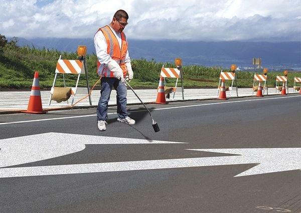 Preformed Thermoplastic Pavement Markings, Legend Reversible Elongated Combo Arrow, Overall Length 20 ft, Overall Width 43 in, Thickness 125 mil, Material Thermoplastic, Color White, Application Method Hand Torch, Shelf Life 2 yr, Standards AASHTO M-249, AASHTO T-250, ASTM D 4592, ASTM D 6628, ASTM E 1710, ASTM E 303, Number of Pieces 1