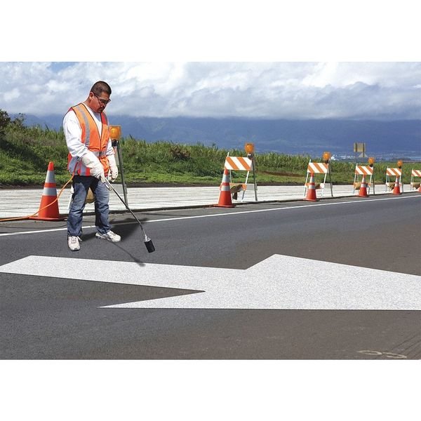 Preformed Thermoplastic Pavement Markings, Legend Left Lane Drop Arrow, Overall Length 18 ft, Overall Width 5 1/2 ft, Thickness 90 mil, Material Thermoplastic, Color White, Application Method Hand Torch, Shelf Life 2 yr, Standards AASHTO M-249, AASHTO T-250, ASTM D 4592, ASTM D 6628, ASTM E 1710, ASTM E 303, Number of Pieces 1